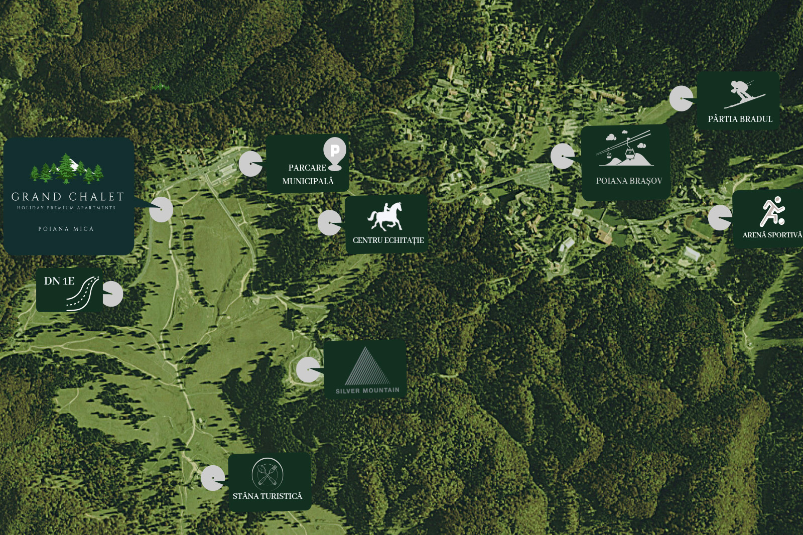 Avantajul major al Grand Chalet este dat de amplasarea la 2 minute distanță, față de Poiana Brașov, cea mai importantă stațiune de schi, din România, care dispune de domeniul schiabil cel mai extins, din țară, aici existând cele mai moderne instalații de transport pe cablu, în total, aici, existând două telecabine, o telegondolă, două telescaune și două instalații de teleschi.
